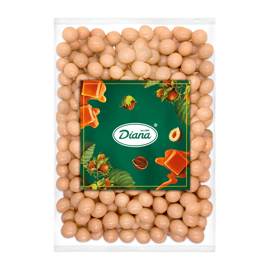 - Zutaten: Karamellüberzug 67% (Zucker, pflanzliches Palmfett, Milchmolke, Reismehl, Sonnenblumenlecithin E322, Gummi Arabicum, Schellack E904, Karamellfarbe, Aroma), Haselnusskerne 33%