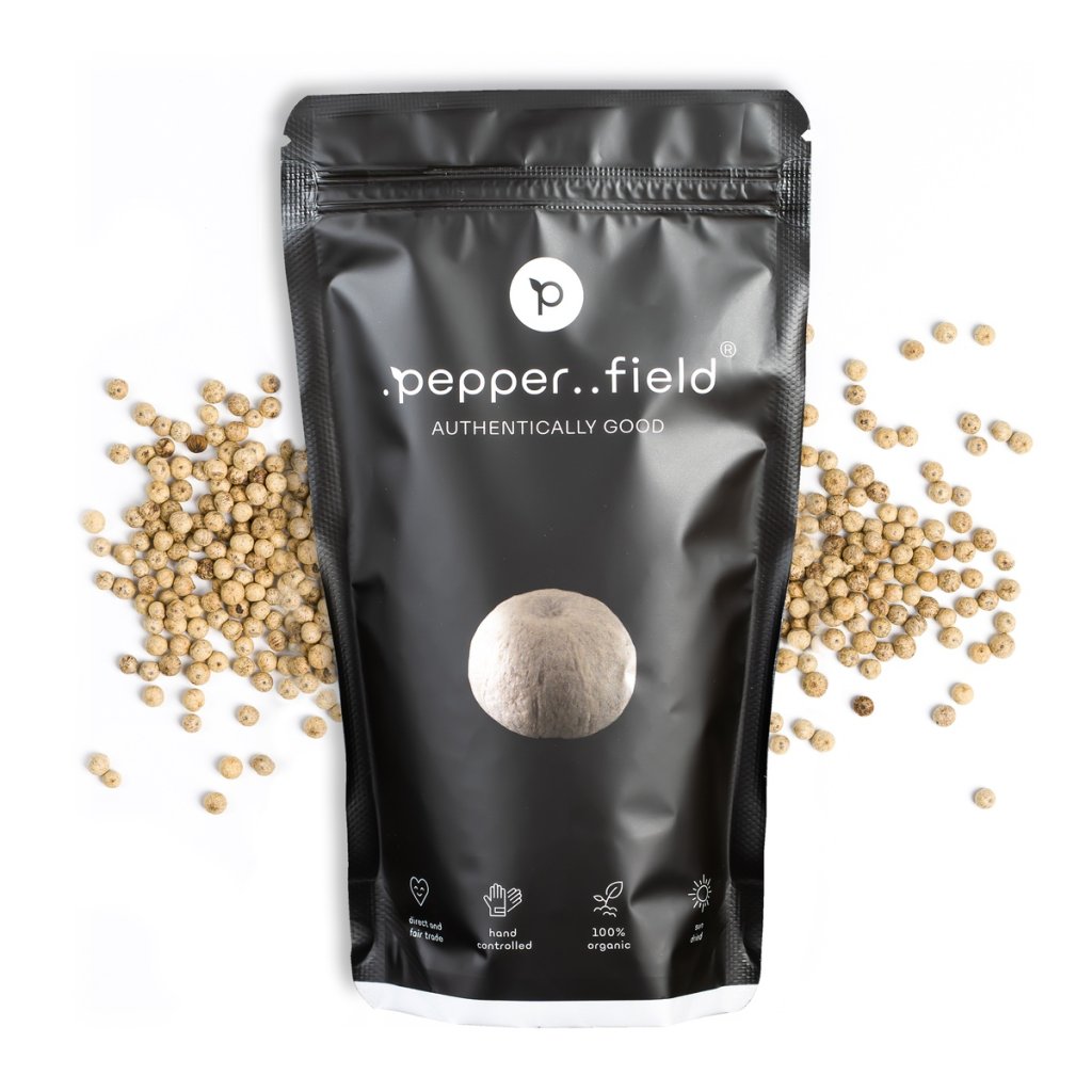 Genießen Sie echten weißen Kampot Pfeffer, der von der tschechischen Firma .pepper..field von kleinen Bauernfamilien importiert wird. 100% frisches und natürliches Produkt.