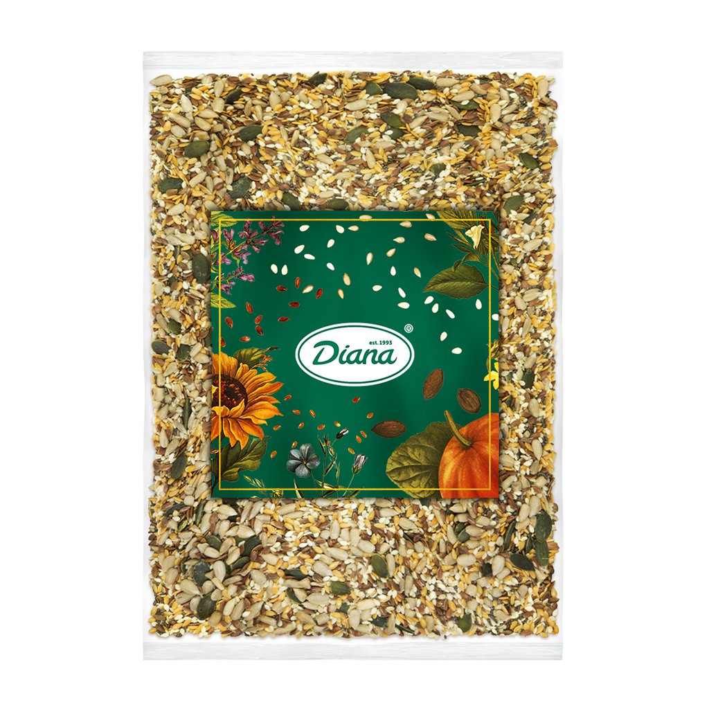 - Zutaten: Samenmischung in unterschiedlichen Anteilen (Chiasamen, braune Leinsamen, goldene Leinsamen, geschälter Sesam, geschälte Sonnenblumenkerne, geschälte Kürbiskerne)
